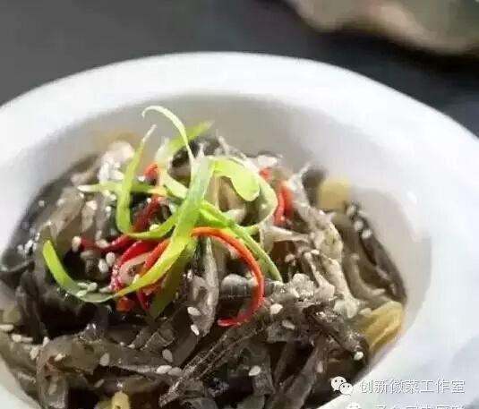 1、青鱼皮洗净,放入碱水浸泡后冲水,略烫,放入冰水中冰镇后切丝。