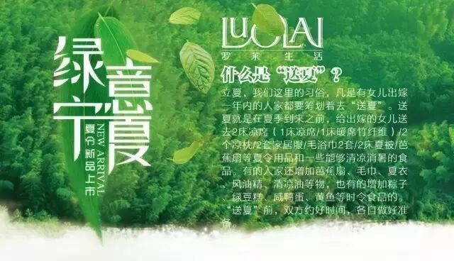 立夏一过,天气一天天热起来,夏天转眼就到了,凡嫁女之家,女孩子出嫁后的第一个夏天,娘家要给女儿女婿送去夏季家居用品。“送夏”的东西一般都要成双成对,寓意“好事成双”。凡是有女儿出嫁一年内的人家都要筹划着去送夏。所谓送夏,就是在夏季到来之前,给出嫁的女儿送去2床凉席、(1床凉席,1床暖席可以竹纤维)2个凉枕、2套家居服,毛浴巾2套,2床夏被,芭蕉扇等夏令用品和一些能够清凉消暑的食品。凡是有女儿出嫁一年内的人家都要筹划着去“送夏”。