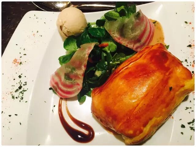 当然除了煎鹅肝,他家的主菜也做的十分不错。主菜煎猪排酱汁偏甜,肉质纤维清晰,不油腻。煎鳕鱼,鱼皮煎的焦脆却保持了肉质的细嫩。搭配的酱汁有丝丝辣味,很上瘾。总的来说菜品水准都很不错。
