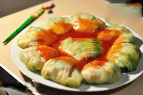 10.煮开后烹入水淀粉搅匀成酱汁淋到包好的生菜包上,即可。