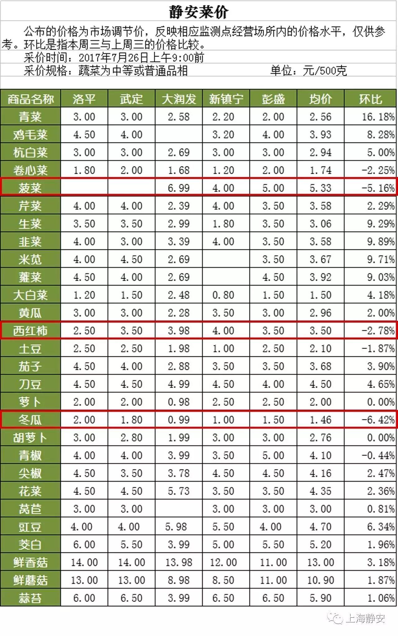 在监测的28个蔬菜品种中,本周有20种的价格较上周同期出现上涨,除了青菜的涨幅超过10%,达到16.18%以外,其余上涨品种的涨幅在1%-10%之间,相对销售价格在小范围内波动。本周环比下跌的6个监测品种中,下跌品种的跌幅在0.44%-6.42%之间。萝卜等2个品种的监测价格与上周同期持平。 ![]()