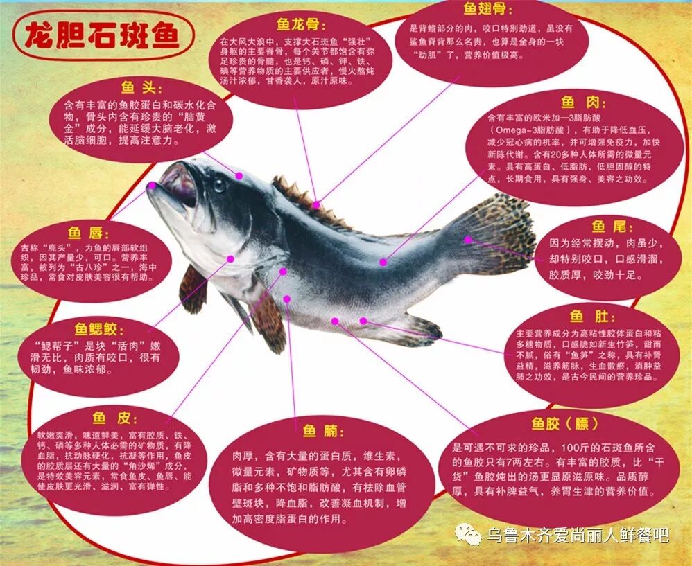一条石斑鱼可以分为鱼头、玉龙骨、鱼翅骨、鱼肉、鱼尾、鱼肚、鱼胶、鱼腩、鱼鳃胶、鱼皮、鱼唇共11个部位,几乎可以说一整条鱼都能吃,毫不浪费。这其中鱼头的口感是最细嫩的,吸食起来会有鱼冻的效果,富含鱼胶原蛋白,也称之为“脑黄金”;鱼龙骨则富含钙、磷、钾等营养物质,经过慢火炖熬,有着甘香袭人、原汁原味的口感;鱼肚则富含高粘性胶原蛋白和多糖物质,口感有如新生竹笋,甜而不腻,也有“鱼笋”之称,具有滋补、生血等功效……总之,11个部位就有11种味道,还能兼顾食客不同的营养滋补需求。尤其5道销魂吃法,让你爱上这条鱼