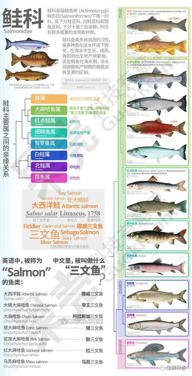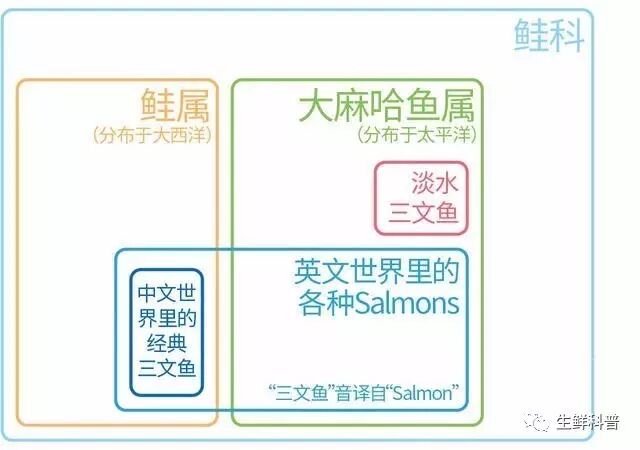 市场上带着其他前缀的三文鱼和大西洋鲑是同科,但并非同属,他们有一个更通俗的名字 — 大麻哈鱼(不是错别字,大马哈鱼也对);