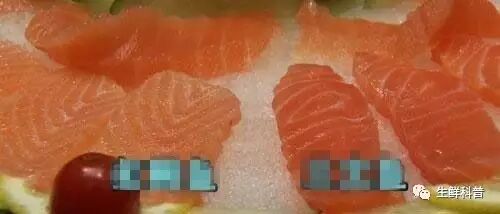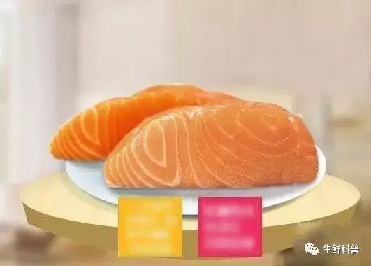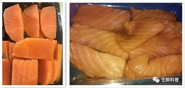 (2)其次,冷冻后再解冻的三文鱼,颜色不鲜艳,会有些发暗,如果多次冷冻再解冻的话,颜色可能会变成橘黄色或杏黄色,而真正冰鲜三文鱼的颜色应该是橘红色的;
