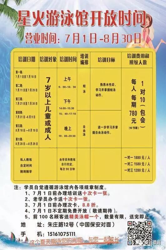 学习培训时间:7月4日到7月26日,8:00--15:00学习,15:15--17:15游泳训练。