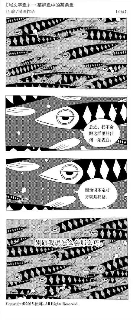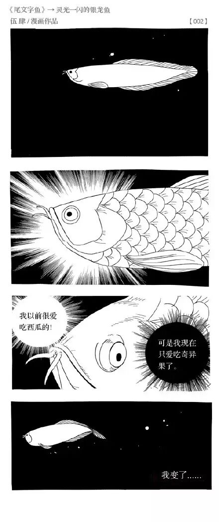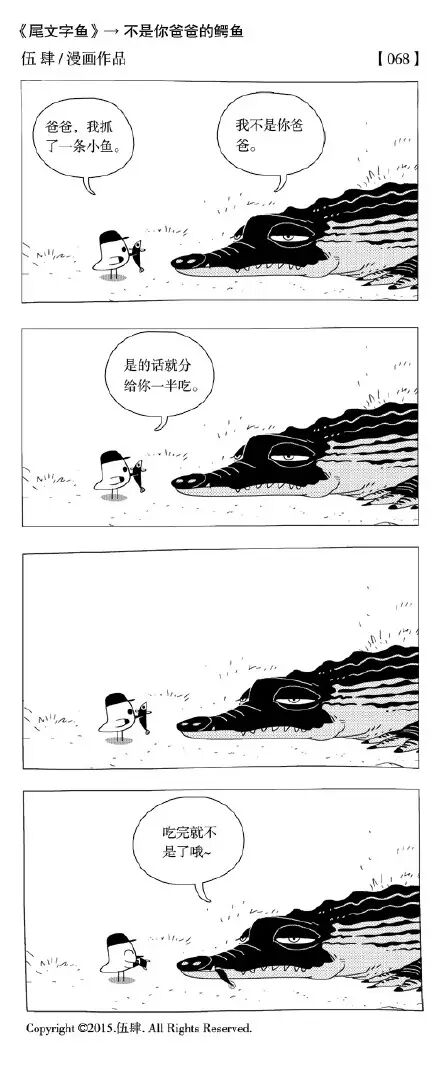 虽然伍肆成名作是《橙子故事》,但我更喜欢他微博连载的无厘头短篇尾文字鱼系列。不管是《灵光一闪的银龙鱼》还是《不是你爸爸的鳄鱼》都充斥着一种脱力又喜感的张力,总能让你“噗嗤”一下笑出声。
