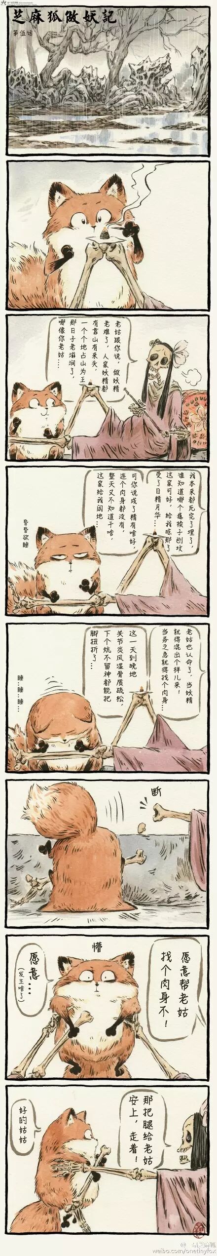 故事是一只毛茸茸的小狐狸芝麻和它那想寻肉身却不成器的妖精老姑唱主角。小狐狸设定非常萌,而老姑则相当喜感,全盘东北大碴子味的对白也是超接地气。颇有连环画气息的画风也很好接受,笑点满满。