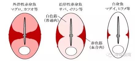 一般规律如上图所示,通常外洋性鱼类为了适应长时间高强度巡游的需要,鱼肉中肌红素含量较高,色泽偏红,近海鱼类巡游距离较短,鱼肉中肌红素含量较低,肉色则偏粉色或白色。