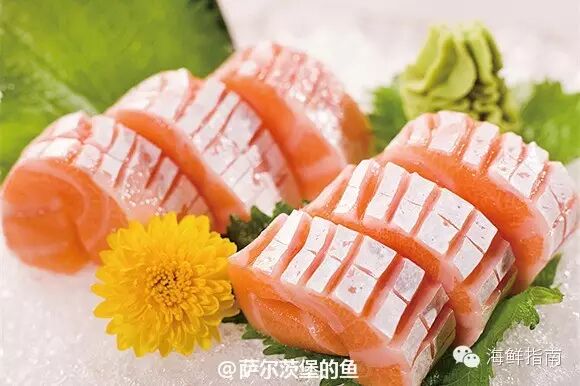 三文鱼鱼腩部位超厚的肌间脂肪层和入口即化的肥腻口感是虹鳟等淡水鱼无法企及的,因为是海水鱼并且有较严格的急冻处理方式,几乎可以放心生食