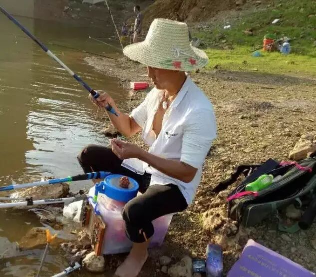 不停的把杆收回,加食,再放进水中,安静的等待鱼儿上钩。