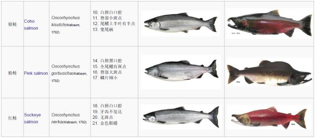 (粉鲑),Silver salmon(Coho 银鲑),其对应科学名与分辩特征详情如下。