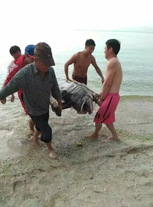 继港口双月湾最近出现了“美到窒息”的“蓝眼泪”外,昨天下午大约四点钟左右,当地青年在港口双月湾对海岸附近捕捞一条超过两百斤重的野生龙趸鱼,俗称巨石石斑,鱼身长有一个成年男子双手张开那么长,着实把小伙伴们震惊了!