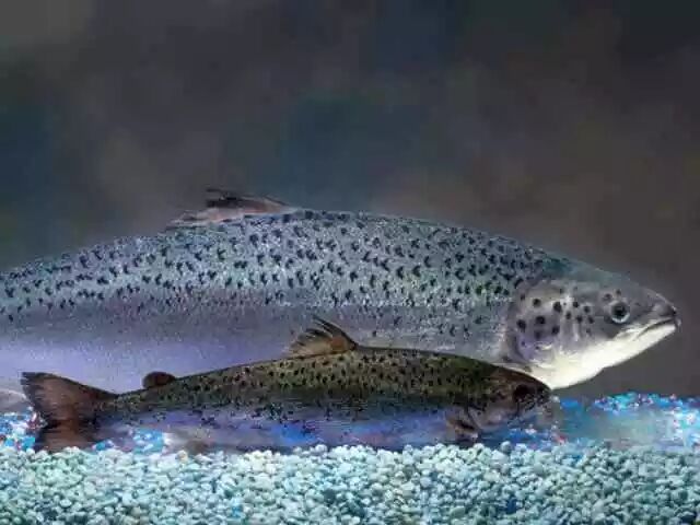 大西洋鲑鱼通常在春夏季节的温暖水流中发育生长,需要3年才能长大,无法满足市场的需求。科学家使用技术手段,在大西洋鲑鱼的受精卵中植入太平洋奇努克三文鱼生长激素基因,以及大洋鳕鱼抗冻蛋白基因。大洋鳕鱼的抗冻蛋白能让转基因鱼在寒冷环境中继续分泌生长激素,进而达到生长周期缩短的目标。转基因三文鱼的生长周期可缩短为18个月,且个头比普通鱼更大。美国食品药品管理局(FDA)在2010年就已完成转基因三文鱼的食品安全评估,目前已经在美国和加拿大获得批准上市,可以放心食用。