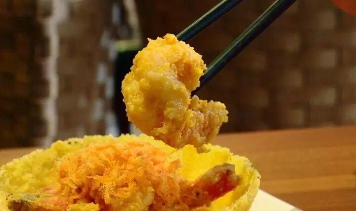 黎老板说,店里有一道非常受欢迎的菜,就是具有东南亚夜市风味的金沙虾球!这可是用越南的鱼露和椰浆腌制的噢!虾肉香嫩、虾头香脆,口感非常有层次,让江松大呼好吃!