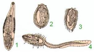 ✔图中①:成虫体形狭长,背腹扁平, 前端稍窄,后端钝圆,状似葵花子,体表无棘。为雌雄同体。