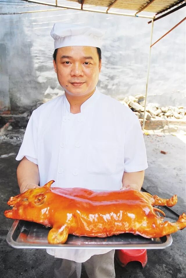 烤一只乳猪约四五个小时,烤出来的乳猪要全身焦黄、油光可鉴、散发着浓郁香味,才算上乘之作。色同琥珀,又类真金,这样的烤乳猪摆在你面前,看之闻之,色香味俱全,让人不禁食欲大动。夹一块入口,轻轻一嚼,脆响的“咔哧”声,声声伴耳,吃下后,仍留满口余香,令人回味无穷。