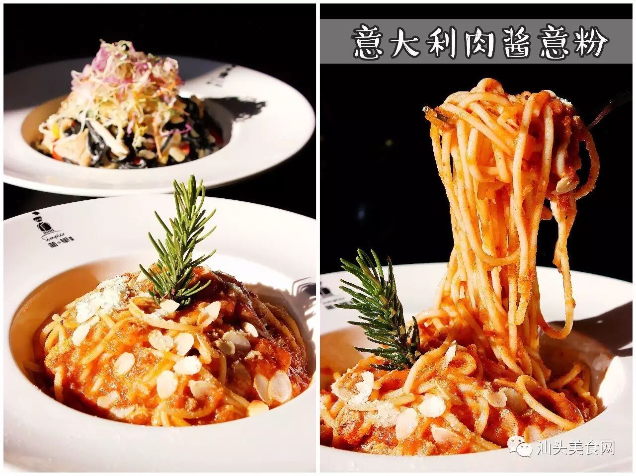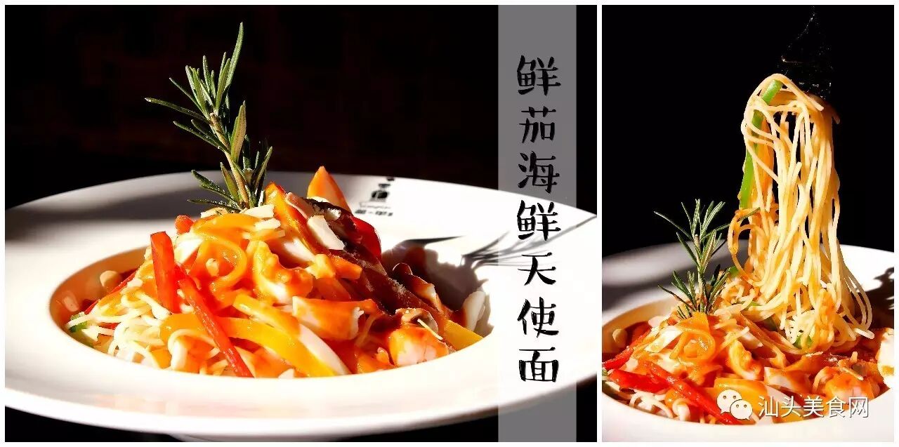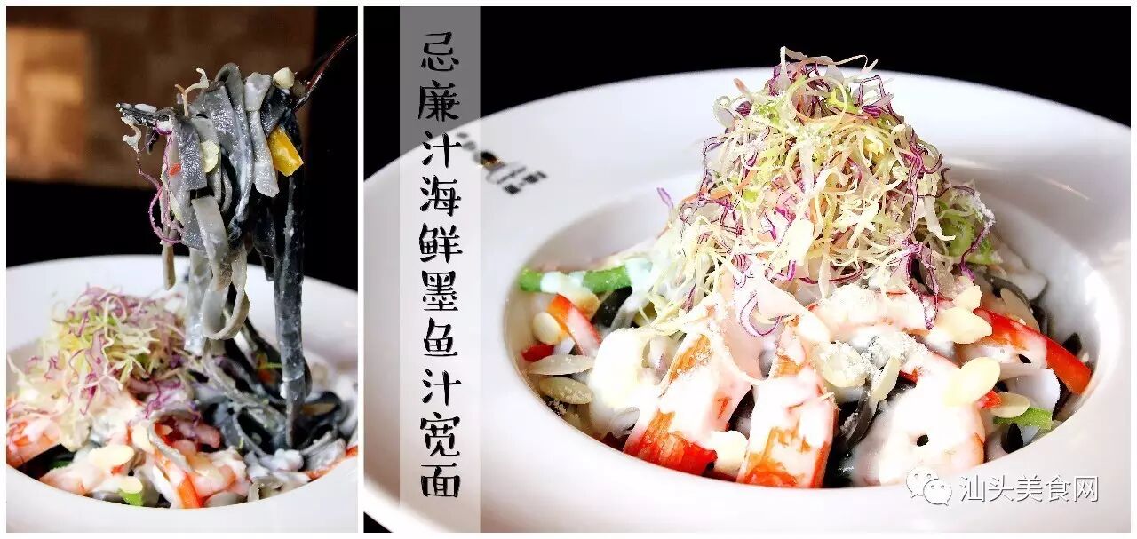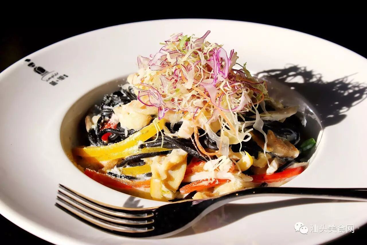 拨开配菜一片黑!这款是宽面,用的还是墨鱼汁,别小看这黑色的汁液,其实慢慢成为健康饮食时尚,在国外是很多健身达人的最爱,特别适合女生。