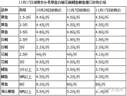 湖南常德地区淡水鱼情况也有所好转,主要是流通量增加了,据安乡淡水鱼流通大户雷伟华介绍,他每天的淡水鱼走量大概在3-4万斤,当地水车老板也比十一月上旬更活跃一些,“现在温度低了,存塘鱼规格的提升空间也很小了,养殖户喂料继续减少,病害方面基本没有什么威胁了”。据了解,最近安乡一带淡水鱼走量最大的依然是草鱼花白鲢这三个品种,“外地市场走量还不是非常好,估计到了下个月会好一些,外地拉鱼的车多了,鱼价也还有上涨的可能”。从塘口收购价格来看,十一月中旬和上旬的鱼价没有什么变化,最近三周的变化也非常小。具体11月17日湖南安乡县淡水鱼参考收购价格如下,1.5-2斤草鱼收购价是4.5元/斤,2-3斤草鱼收购价是4.5元/斤,3-5斤草鱼收购价是4.8元/斤,2.5斤白鲢收购价是1.9元/斤,3斤白鲢收购价是2.3元/斤,2.5斤花鲢收购价是4.1元/斤,3斤花鲢收购价是4.5元/斤,1斤以上鲤鱼收购价是3.7元/斤,9两以上鳊鱼收购价是4.3元/斤,8斤青鱼收购价是8元/斤,8两以上湘云鲫鱼收购价是5.4元/斤。
