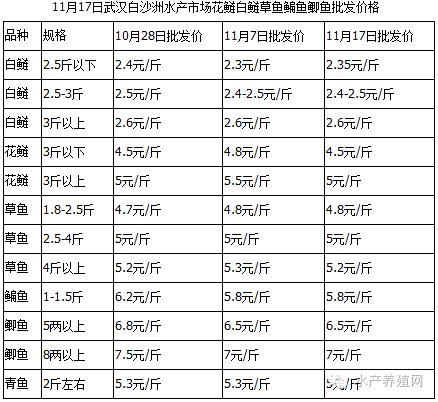 在十一月上旬销量的基础上,武汉白沙洲水产市场常规淡水鱼走量继续增加,目前每天达到了500-600万斤,据批发大户刘少新介绍,最近一阵子湖北大湖里的花白鲢上的量比较大,大小规格的花鲢价格都有下跌,白鲢鱼因为加工厂的需求量支撑,价格暂时稳定。另外草鱼鲫鱼鳊鱼价格也保持稳定,2斤左右的小规格青鱼价格略有下滑,从最近三周的价格走势来看,市场走量最大的草鱼和花鲢价格维持稳定,其余品种有小幅下跌“市场销量后期还会继续增加的,估计到了下个月十五号以后,鱼价会有些上涨”。具体来说,11月17日武汉白沙洲水产市场2.5斤以下白鲢批发价是2.35元/斤,2.5-3斤白鲢批发价是2.4-2.5元/斤,3斤以上白鲢批发价是2.6元/斤,3斤以下花鲢批发价是4.5元/斤,3斤以上花鲢批发价是5元/斤,1.8-2.5斤草鱼批发价是4.8元/斤,2.5-4斤草鱼批发价是5元/斤,4斤以上草鱼批发价是5.2元/斤,1-1.5斤鳊鱼批发价是5.8元/斤,5两以上鲫鱼批发价是6.5元/斤,8两以上鲫鱼批发价是7元/斤,2斤左右青鱼批发价是5元/斤。