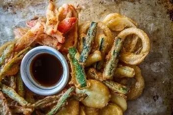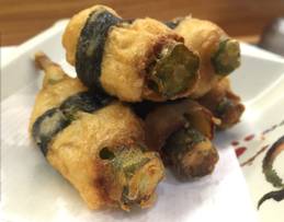 天妇罗是日式料理中的油炸食品,用面粉、鸡蛋与水和成浆,将新鲜的鱼虾和时令蔬菜裹上浆放入油锅炸成金黄色。它 不是某个具体菜肴的名称,而是对油炸食品的总称,昨晚食鲜美给我们推荐了新品炸秋葵