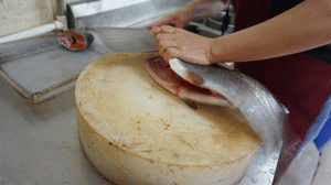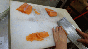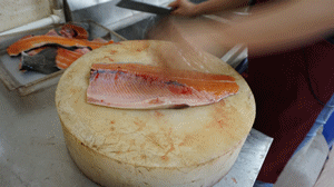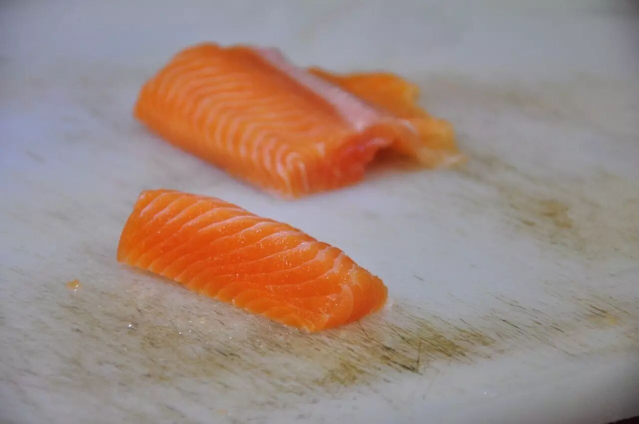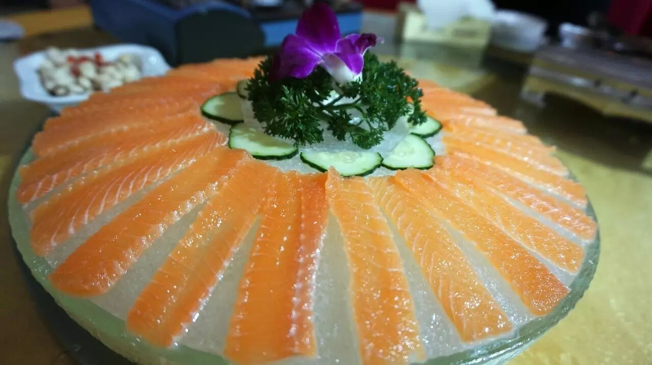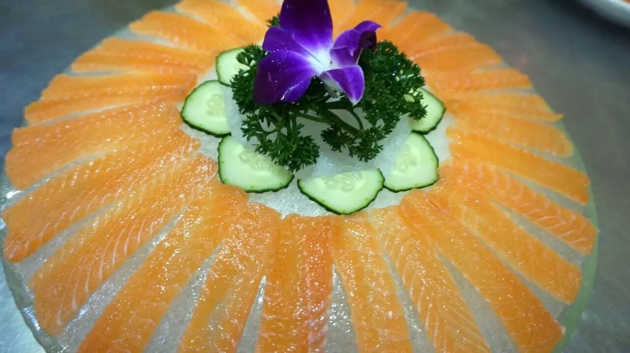 三文鱼更为重要的一部分就是它的切片过程。这家店是有专门师傅进行切片,更是有许多大酒店的厨师特意过来学艺的。要手法稳,切的鱼片薄细均匀,透光可见纹路,这可不是三年五载就能出师哒~