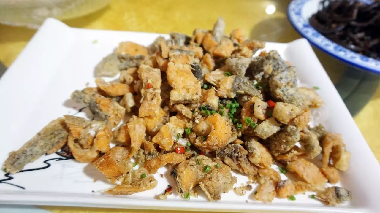 虹鳟三文鱼骨椒盐——把鱼骨上少有的嫩肉,以及剖下来的鱼皮在热油里边入锅瞬间提起,鱼骨就变得格外酥脆,撒上花椒盐出锅。保留了鱼香,更是入口清脆,鱼骨都全部可以嚼碎。