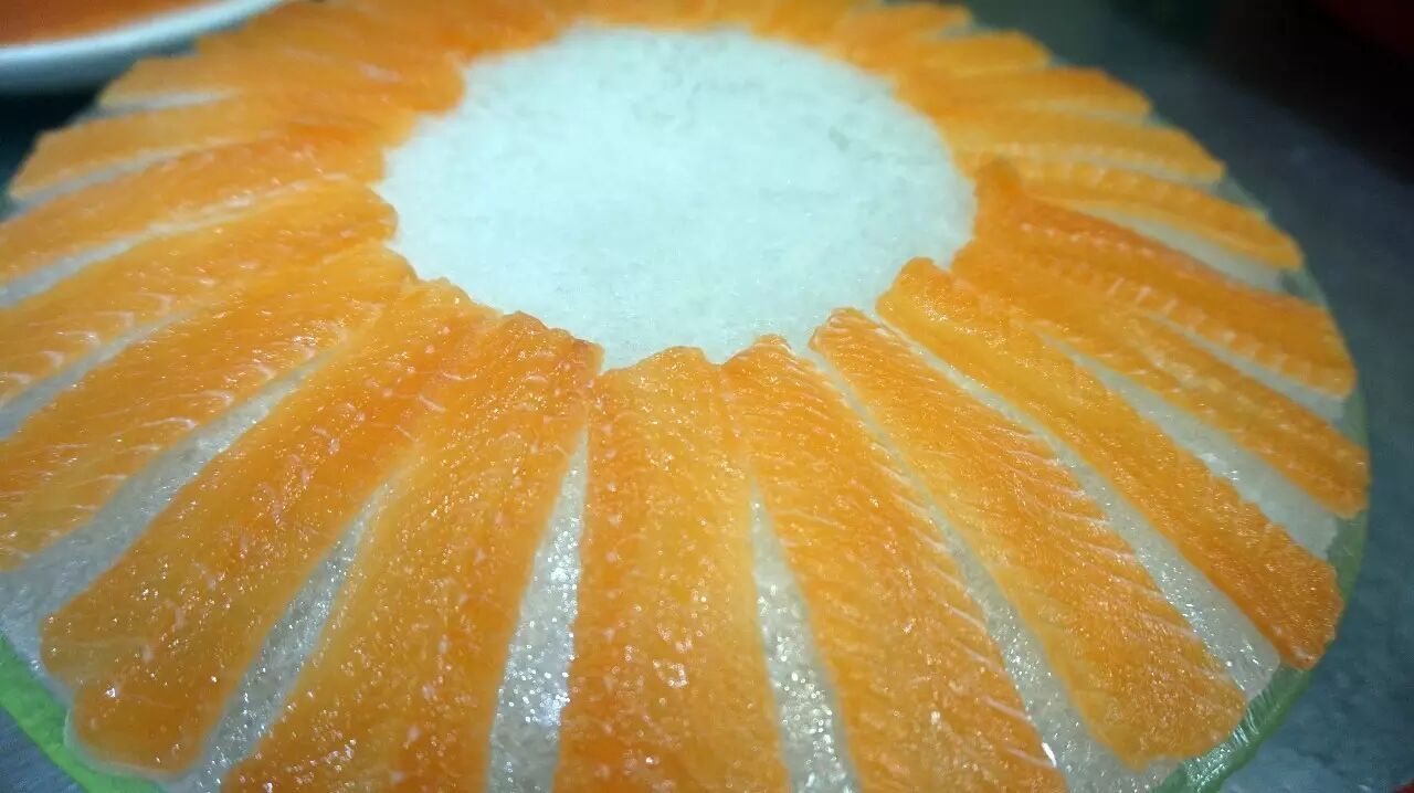 鱼骨的地方全部剔除干净,鱼皮全部去除,只剩下透明鱼肉色的三文鱼片,上冰沙摆盘上桌。这还只是一鱼三吃的第一种吃法——虹鳟三文鱼刺身。