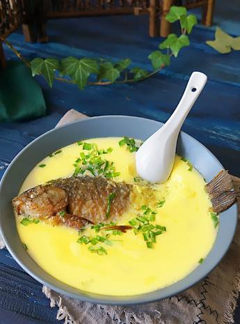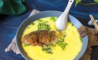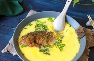 将煎好的鲫鱼放入一个大碗中稍微放凉,倒入鸡蛋液洒上葱花,没过鱼身的一半即可
