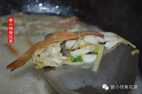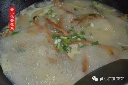 9.水汤呈奶白色的时候放入已泡好的管小伟黄花菜;