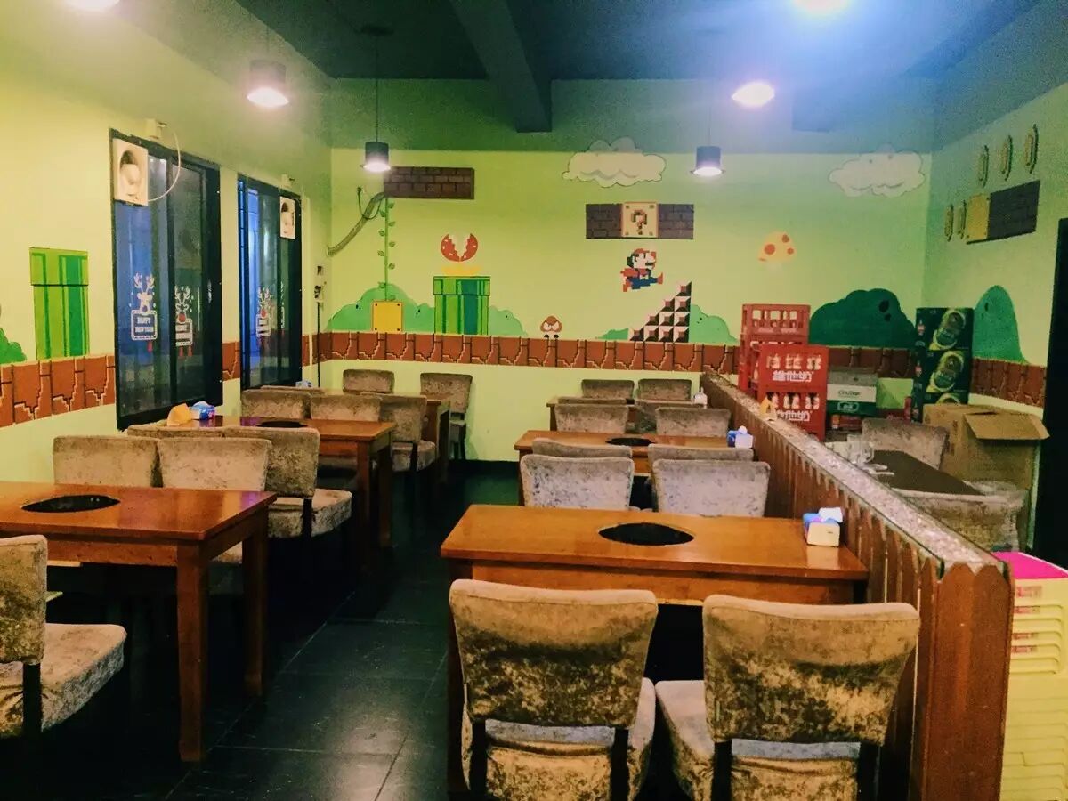 店里的墙绘全是超级玛丽,连空调都包成了土砖,我还真看见过有个喝醉了的满哥,边用脑袋顶空调边自己配音“灯灯灯,等灯凳”。