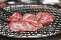 弹性十足、不塞牙是调味牛五花的最大特色。烤至五分熟,不用翻面,在酱料里捣一圈,慢慢地放入口中,便足以让人兴奋起来。