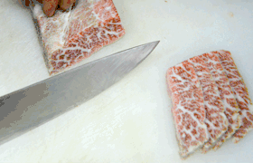 水晶牛肉被切成菱形摆成花放在我面前,再也抵触不了它的诱惑。全部摆上去,等肉汁渗出时就差不多了,一定要一口吃,不然没有口感!