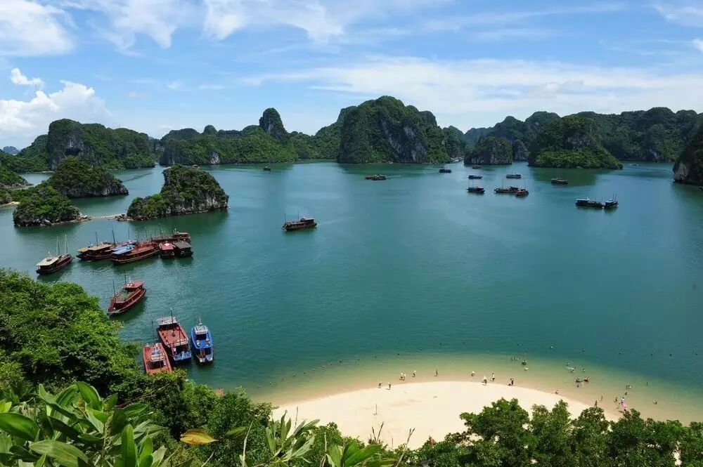 早餐后往寻洲岛,乘越南特色红木游船,倘佯于万顷碧波之中;漫游被国际教科文组织评为世界自然遗产之一的“海上桂林”—下龙湾(游览时间约6H,含天堂岛)(在1500多平方公里的海面上、耸立着3600多座大小不一、千姿百态的喀斯特地貌的山石、更以其“海美、山幽、洞奇”三绝而享誉天下)、斗鸡岛、狼狗石、香炉山等、数不胜数的风景尽收眼底、下龙湾亦有小渔船如影相随,可向渔民就地购买些许刚打捞而起的各种鱼、虾、蟹等美味海鲜,让游船厨工加工烹饪。中餐于游船上把酒临风,去国怀乡之忧荡然无存,在天海一色中的游船上大快朵颐的美妙感觉在您的全身悄悄蔓延。午餐后前往越南最浪漫、最漂亮的岛屿—【天堂岛】,天堂岛是下龙湾唯一有沙滩的岛屿,金黄色的沙滩,蔚蓝色的海水,仿佛置身世外桃源一般,登上天堂岛,领略“会当凌绝顶,一览众山小”的感觉,环顾四周,如同进入蓬莱仙境。随后乘船前往月亮湖,抵达洞口后换成小木船进入洞内游览【月亮湖】,【欧美线路】月亮湖是一个360度皆为垂直绝壁的封闭海湾,空灵幽闭。湖水清澈见底,水平如镜,从上面俯瞰圆如满月,所以称为月亮湖,游览进入天下新一大拇指山,青蛙山,望夫石等一系列海上美景。游览【迷宫仙境】,,游玩后坐船返回码头下船,告别上帝赐于越南最好的礼物---下龙湾,乘车前往越南首都河内。沿途可欣赏田园风光等各种异国风景,中途用晚餐, 抵达河内后办理入住手续;自由活动。