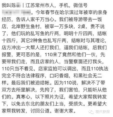 江苏常州网友陈先生近日发微博称,到哈尔滨旅游被导游带到北岸野生鱼村吃饭被宰,2桌人花费10302元。其中一份鳇鱼中段铁锅炖价格为5731元,一份赶条鱼中段铁锅炖价格2279元。单价398元的鱼,结账时由10.4斤变成了14.4斤。陈先生在与店方理论时,却被按在地上打……