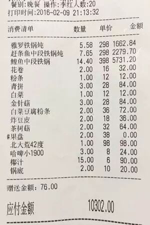 陈先生的微博照片里有一张结账小票。结账显示应付金额是10302元,一共11个菜,一个果盘,3个酒水饮料,一个锅底。小票上,花卷2份32元,青拼3份84元,茶树菇2份64元等等,这些看上去似乎都还算正常……