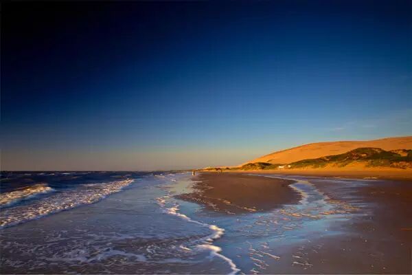 骗纸!说好的文艺大片儿呢?别急,大片儿就在沙丘上!翡翠岛被称作“沙漠与大海的吻痕”,名字本身就透着一股浪漫气息。午后3点多去,碧海相接的金色沙丘在阳光下美到极致。赤脚踩在细沙上,细软的沙粒带着凉意渗到趾缝,那种细腻感简直太赞了。抬眼远望,起伏的沙丘沿着海岸一路绵延,最高处有40多米;沙丘上布满了深深浅浅的脚印,童趣十足;沙丘西部是一片葱绿的草木,东部紧邻碧蓝的大海,“沙漠海滩”的奇景令人惊叹。