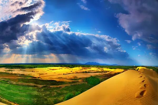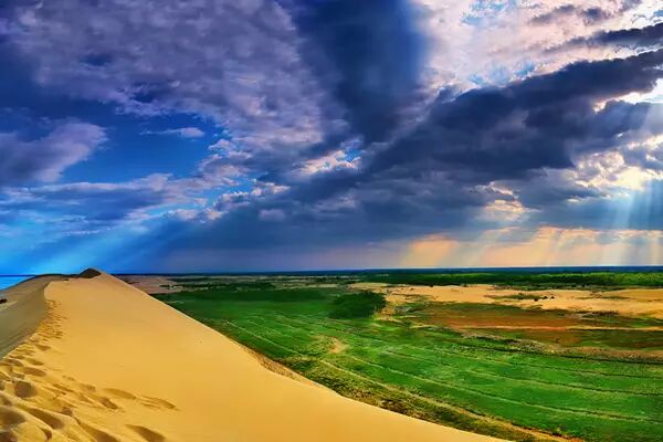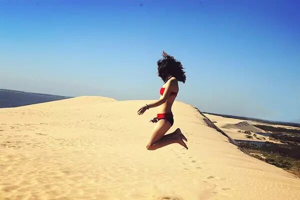 爬上沙丘就可以随便拍照了,长枪短炮在这里出好片儿的概率是100%,嫌累的话用卡片机和手机拍拍,说是在巴厘岛度假也没人会怀疑。特别提醒爱臭美的妞儿们,一定要备一件大红或玫粉色长裙、比基尼,配上蓝天、黄沙,你能想象有多美!不过拍照的时候要格外小心,因为这儿的沙细到无孔不入,如果不小心滑倒,拍照设备就要悲剧地接受细沙的洗礼了。时间充裕的话,可以沿着沙丘一直往前走,远一点的地方几乎没有脚印,出片儿堪称完美!