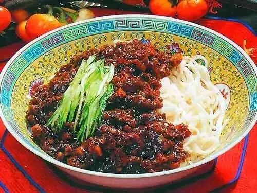 ▲老北京炸酱面:菜码有豆芽、芹菜、青豆儿、黄瓜丝等,吃起来甭提多么爽了。