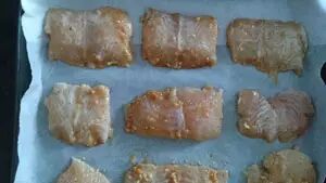 腌制好后,整齐的码放在烤盘上,烤箱预热后,温度220度,时间15分钟,放入烤盘即可。